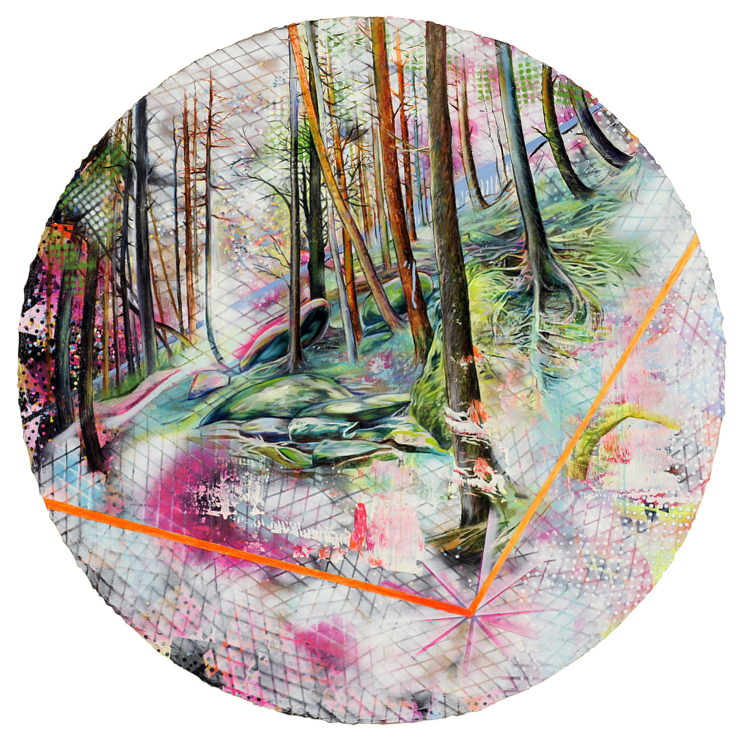 Across the series, Wölk reduces figuration to fleeting presences: a bending male figure in one work, a woman concealed between the birches in another. Their partial disappearance underscores how human agency drifts to the periphery of these radiant ecosystems. The interplay of Pop-art fragments, sprayed overlays, and sharply rendered painterly passages enacts a visual tension between immediacy and construction, between atmospheric immersion and digital flatness. Ultimately, Fluorescent Timberlands renders the forest as a luminous threshold—an unstable place where perception flickers between the natural world and its artificially intensified counterpart.
