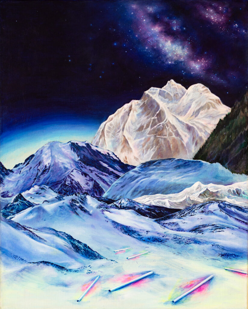 In Evening Radiance, Anne Wölk investigates the fleeting, atmospheric phenomena that transform mountain landscapes into radiant displays of color. Drawing from the vivid hues of sunset and the reflective surfaces of wet alpine slopes, she translates this ephemeral light into layered, luminous paintings. By combining deep glazing techniques with nuanced color modulation, Wölk captures the delicate balance between natural luminosity and the viewer’s perception, creating scenes where peaks appear to glow from within and the boundaries between sky and mountain dissolve.