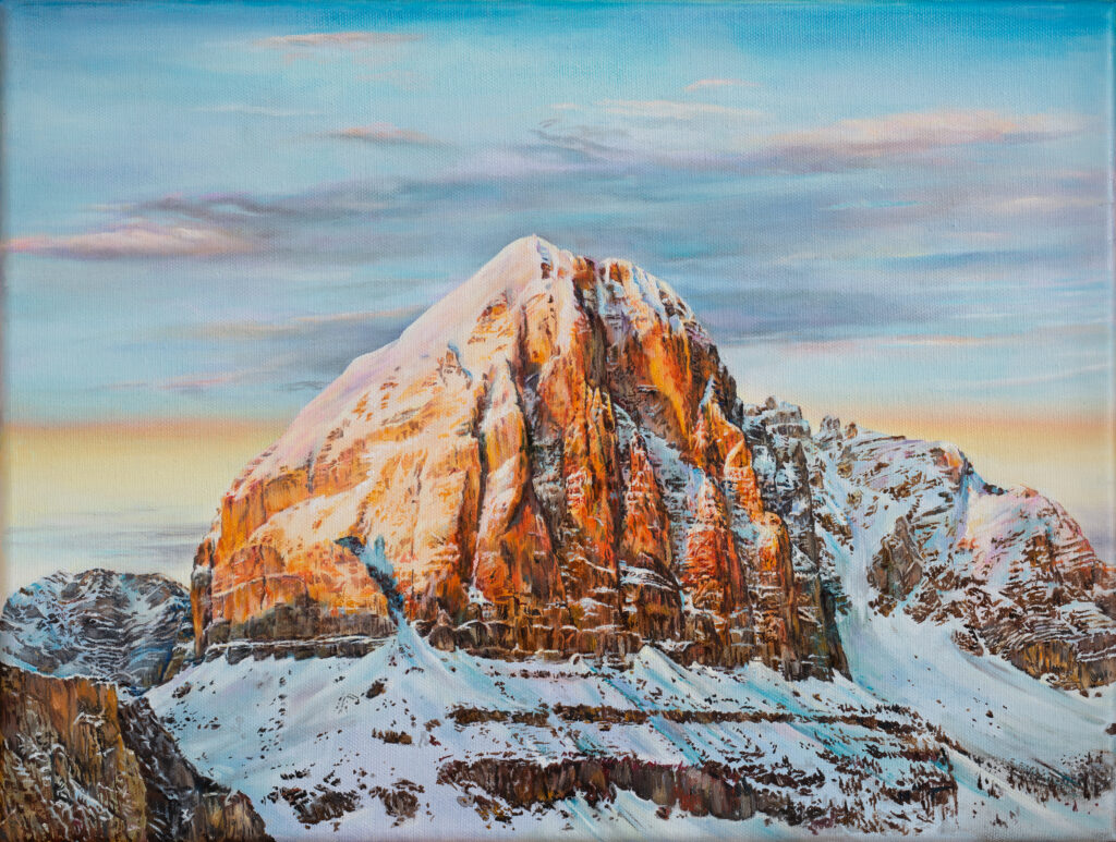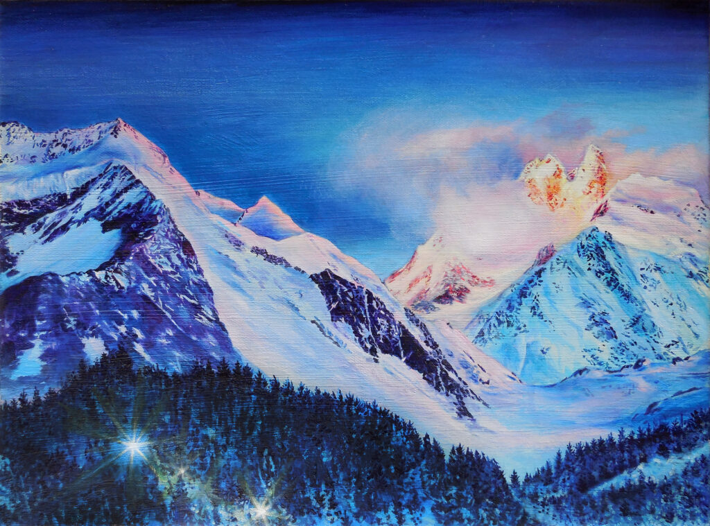 The series positions light itself as the central subject, exploring how transient atmospheric effects evoke emotion, memory, and contemplation. Through her meticulous rendering of alpenglow and afterglow, Wölk transforms the Alps into meditative spaces where time, weather, and topography converge in color and atmosphere. Each painting invites the viewer to witness a phenomenon that is at once fleeting and eternal, reflecting on how human perception engages with nature’s most luminous moments.