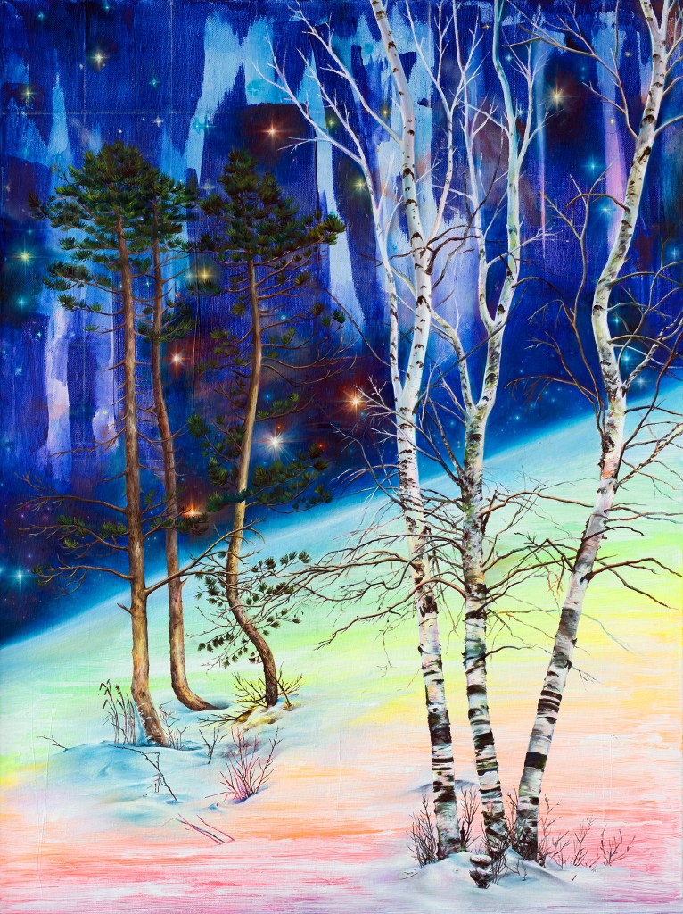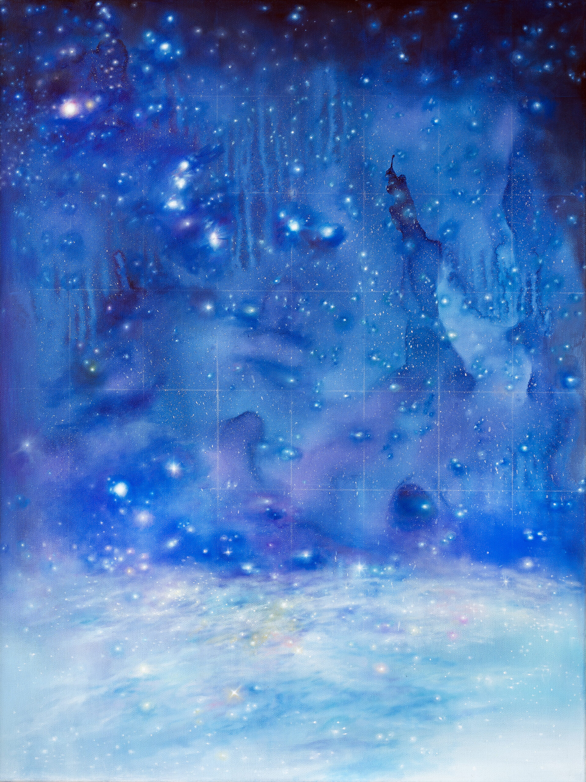 In Light-Years of Becoming, Anne Wölk turns to the vast stellar nurseries of the cosmos—immense cloud formations composed of dust, hydrogen, and helium that give rise to new stars. Drawing inspiration from the high-resolution imagery of the James Webb Space Telescope, she translates these unreachable regions into painted spaces that can be encountered on a human scale. Through layered chromatic atmospheres and finely modulated celestial details, Wölk constructs luminous worlds where distant suns appear as delicate points of light. These seemingly fragile marks evoke astronomical structures of incomprehensible magnitude, bridging the expanse between cosmic immensity and intimate visual perception.