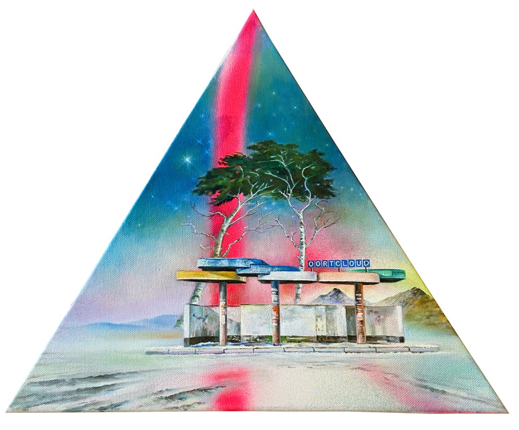 In Cosmic Terrains, Anne Wölk transports the viewer into imagined extraterrestrial landscapes, where cinematic memory, scientific speculation, and art-historical lineage intersect. Drawing from the deep chromatic atmospheres of 17th-century nocturnes as well as from the visual language of contemporary science fiction, she constructs luminous worlds that hover between the familiar and the unknown. Translucent glazes, starbursts of artificial color, and digitally inflected horizon lines generate environments that echo both the sublime emptiness of outer space and the mediated glow of the present day. Within these otherworldly settings, the viewer encounters terrains that are less planetary than psychological—spaces where human desire for exploration, escape, and transcendence quietly unfolds.