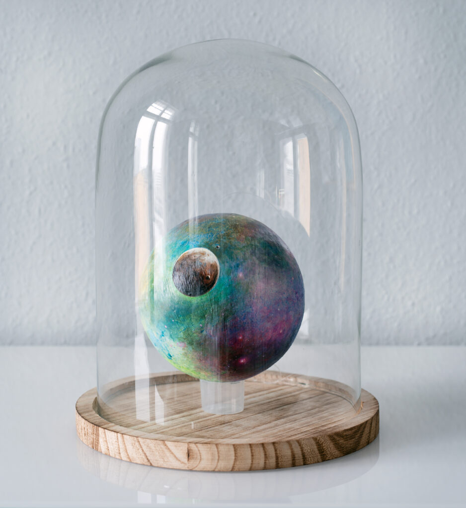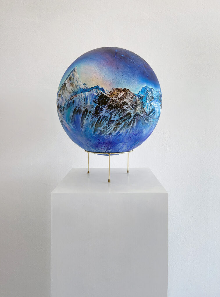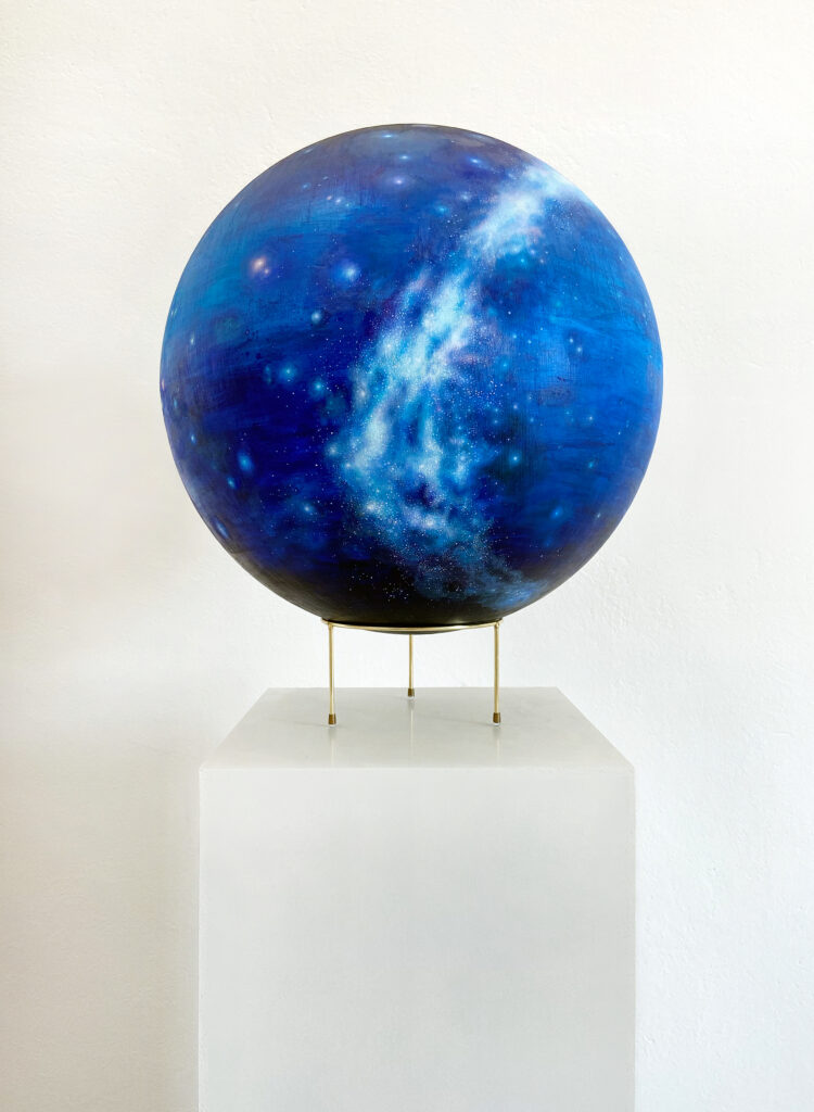 Wölk’s sky landscapes are realized as three-dimensional paintings on spheres of varying sizes, suspended freely in space. Executed slowly and with meticulous precision, the works are painted in acrylic on styrofoam. Drawing on astrophotographs from space telescopes, the spheres present fictional and poetic interpretations of possible extraterrestrial worlds. They evoke a contemporary form of romanticism, echoing the 19th-century fascination with the sublime and the unknown, while reflecting on future colonies on distant planets and the enduring question of life beyond Earth.
